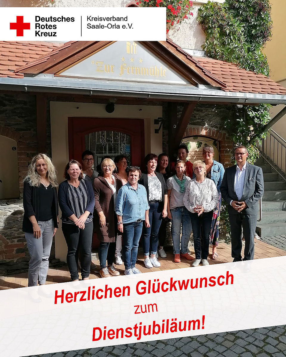 Insgesamt 32 Mitarbeiterinnen und Mitarbeiter unseres Verbandes konnten im 3. Quartal ein Dienstjubiläum begehen. Die Anzahl der Dienstjahre reicht von 5 bis 35 Jahren Betriebszugehörigkeit. In Wertschätzung dieser beachtlichen Leistung hat der Vorstand unseres DRK-Kreisverbandes Saale-Orla e.V. und die Geschäftsführung der Tochtergesellschaften die Jubilare in die "Fernmühle Ziegenrück" eingeladen und die Ehrung bei leckerem Kaffee und Kuchen und auch einem Gläschen Sekt vorgenommen.