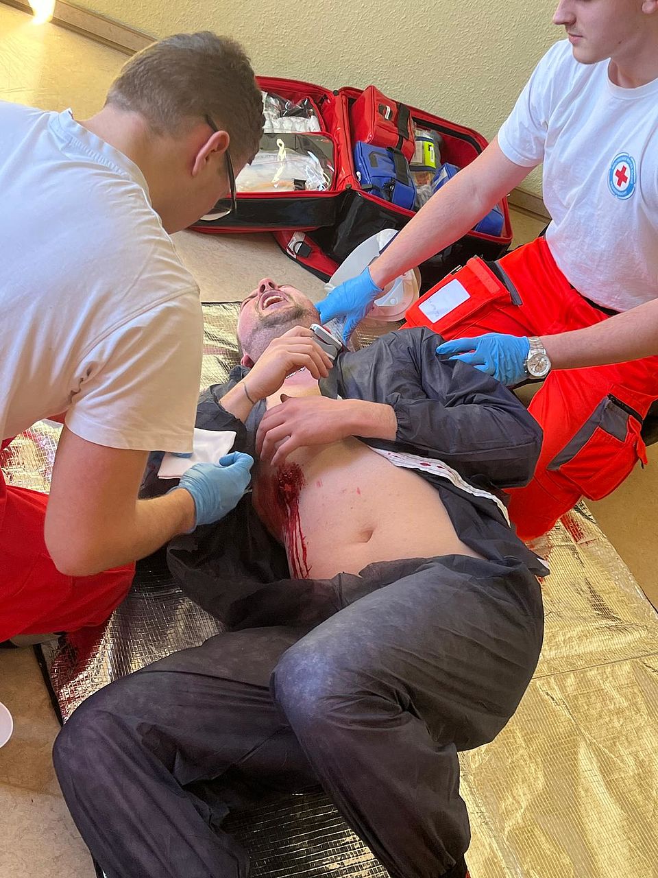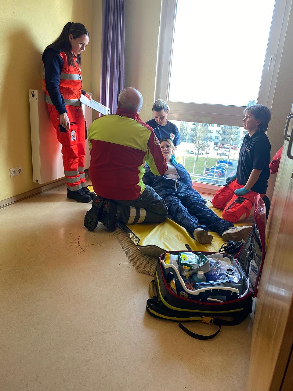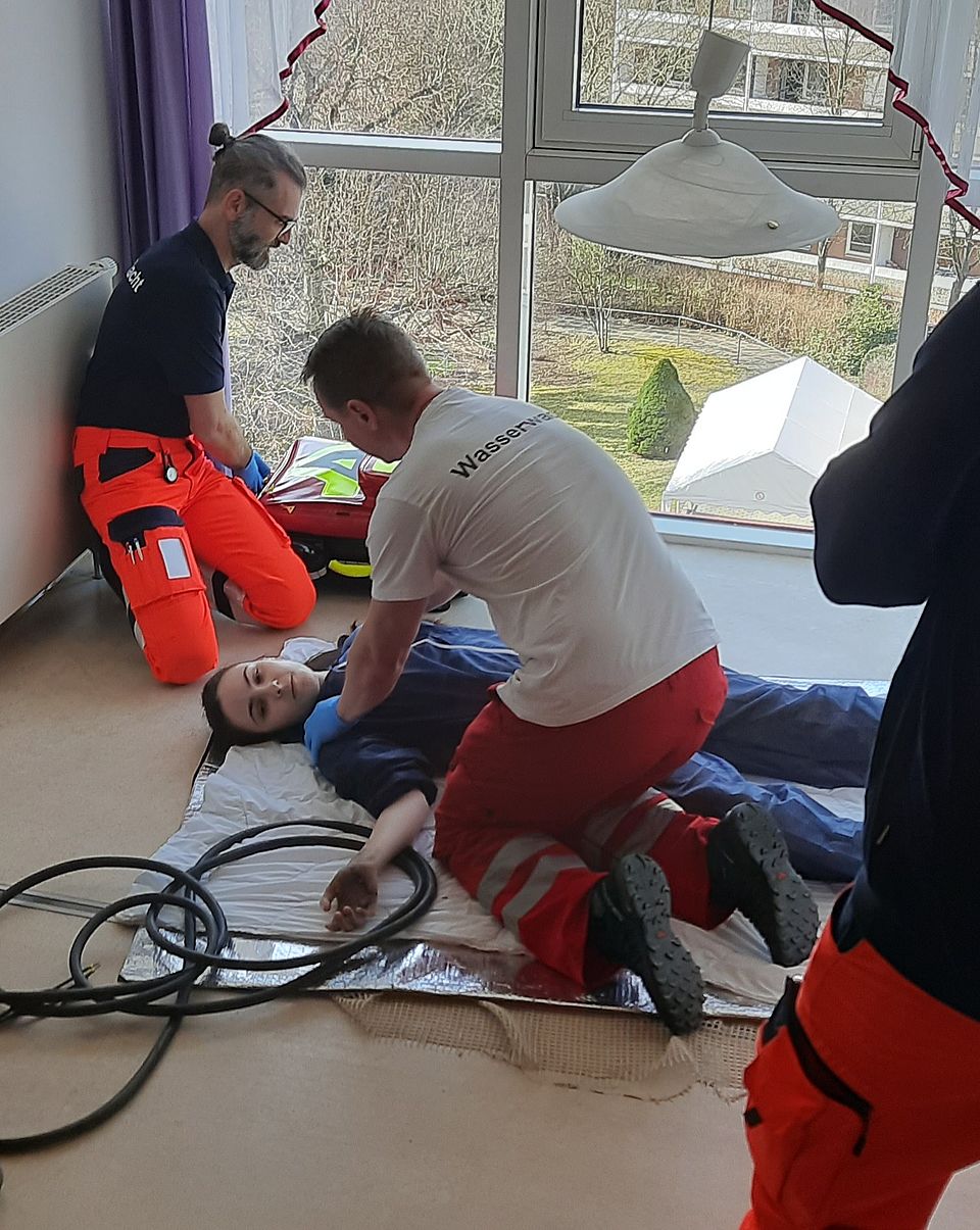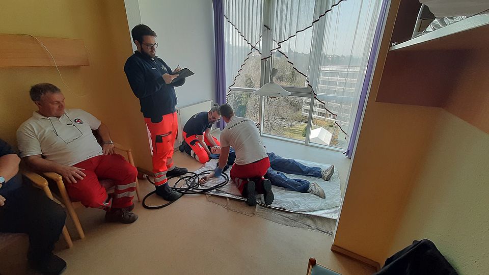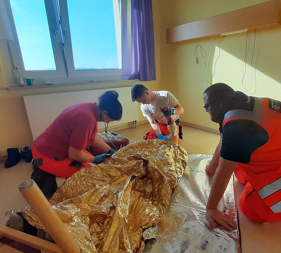 Am letzten Wochenende haben wir eine zweitägige Fortbildung Erste Hilfe/Sanitätsdienst für unsere ehrenamtlichen Helfer aller Gemeinschaften durchgeführt. Dabei übten 40 Ehrenamtliche insgesamt 12 verschiedene Notfallszenarien vom Sturz einer Reiterin vom Pferd mit Wirbelsäulenverletzung bis zur Hyperventilation. Als Anleitende für die Fallbeispiele brachten sich die Notfallsanitäter-Azubis ein. Rettungssanitäter aus unserm Rettungsdienst spielten hervorragend die Mimen. Auch für die Durchführung insgesamt unterstützten uns Praxisanleiter aus dem Rettungsdienst und der Pflege. Für die hervorragende Verpflegung konnten wir auf unsere Küche in Pößneck zurück greifen. Allen Organisatoren, Mitwirkenden und Unterstützern gilt unser herzlicher Dank.