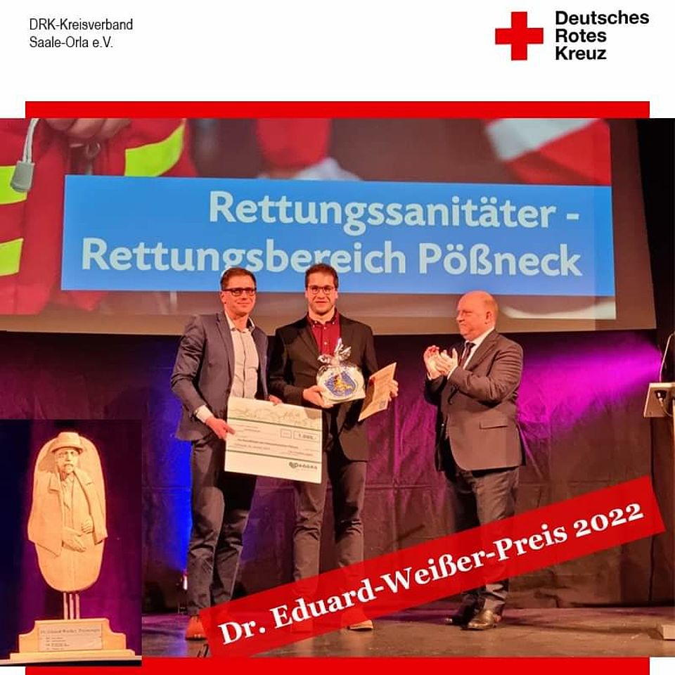 Am gestrigen Abend wurden durch den Pößnecker Bürgermeister, Herrn Modde, unsere Beschäftigten des DRK-Rettungsdienstes „Obere Saale“ gGmbH aus Pößneck mit dem “Dr. Eduard-Weißer-Preis 2022“ geehrt und mit einem Preisgeld in Höhe von 1.000 Euro, welches ein Unternehmen gesponsert hatte, ausgezeichnet.