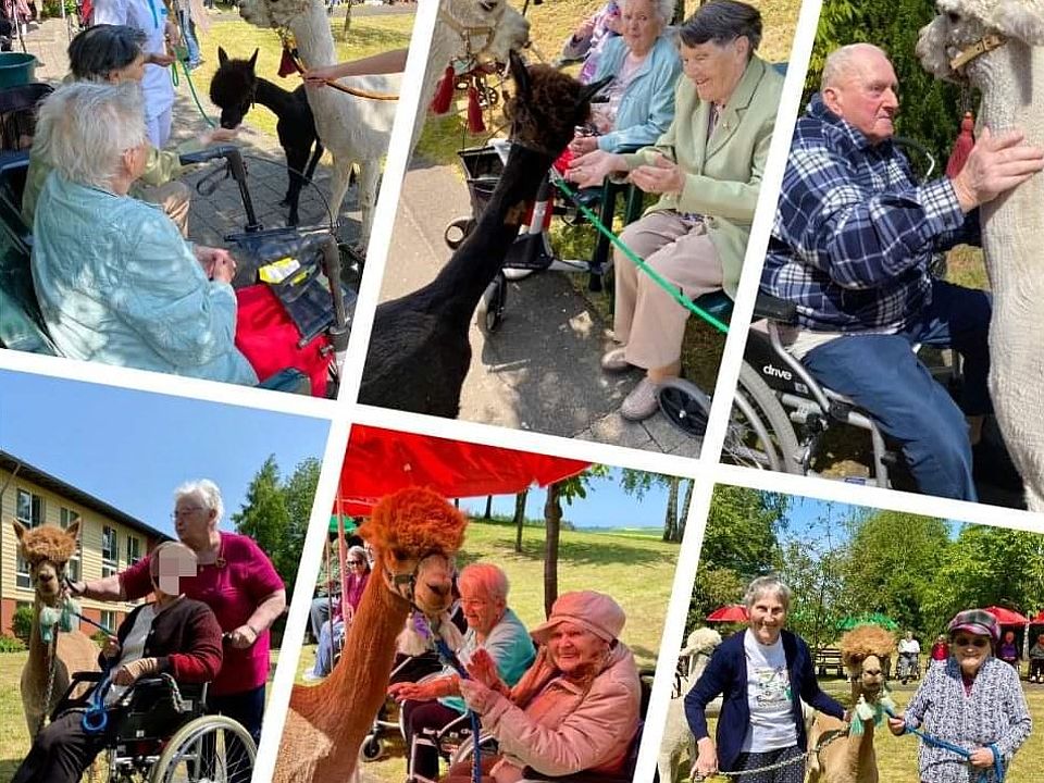 Im Pflegeheim in Bad Lobenstein hatten die Bewohnerinnen und Bewohner kürzlich Besuch von fünf Alpakas. Die Tiere konnten gestreichelt, gefüttert oder einfach nur angeschaut werden. Einige Bewohnerinnen und Bewohner gingen gemeinsam mit den Alpakas im Garten spazieren. Die flauschigen Besucher machten auch Halt bei Heimbewohnerinnen und Bewohnern, die ihre Zimmer nur schwer verlassen können. Zum Dank erhielten diese jede Menge Streicheleinheiten.