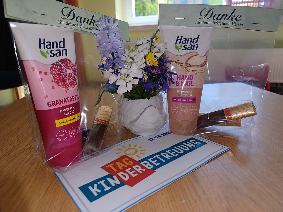 Am 12. Mai ist der Tag der Kinderbetreuung. Dies haben wir zum Anlass genommen, unseren pädagogischen Fachkräften in allen 4 Kindergärten unseres Verbandes ganz besonders zu danken. Mit den Worten „Danke für deine helfenden Hände“ konnte sich jeder über Handcreme freuen. Etwas Süßes war natürlich auch dabei! Die tägliche Arbeit von unseren pädagogischen Fachkräften hat enorme Bedeutung für Kinder, Eltern und auch die Gesellschaft.