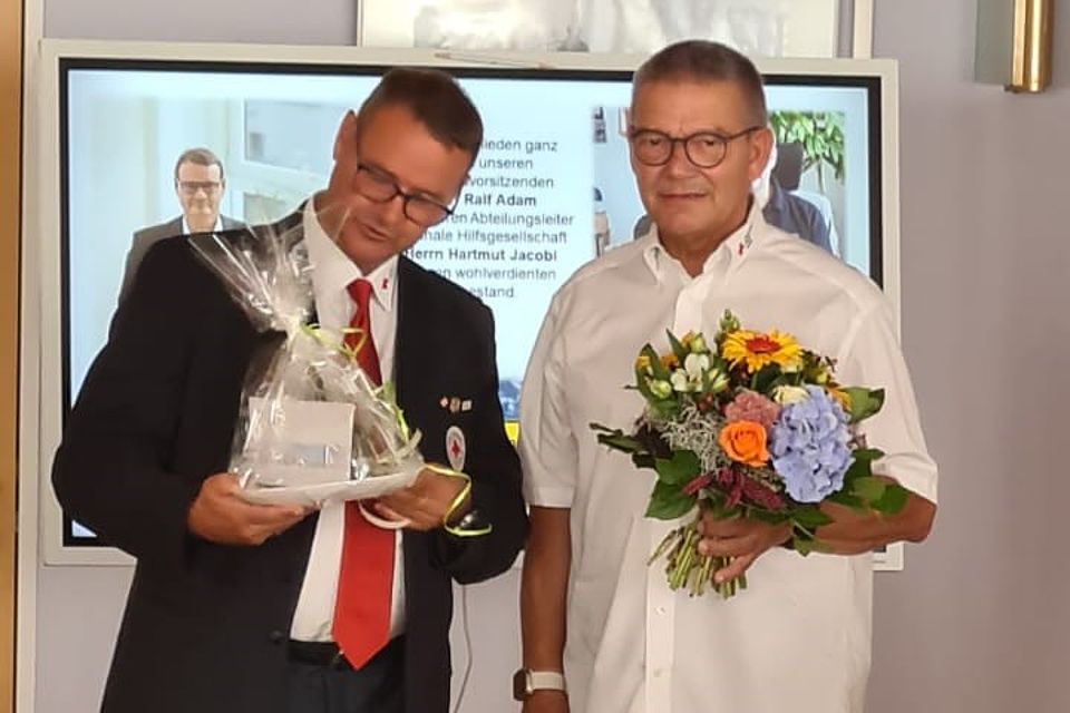 Am 28. September 2023 wurden Herr Ralf Adam und Herr Hartmut Jacobi gebührend in ihren wohlverdienten Ruhestand verabschiedet. Im feierlichen Rahmen in unserem Pflegeheim in Pößneck-Ost wurde der Abteilungsleiter Nationale Hilfsgesellschaft, Herr Hartmut Jacobi, nach 42 Dienstjahren verabschiedet, bleibt unserem Verband aber als ehrenamtlicher Rotkreuzler erhalten. Der Vorstandsvorsitzende, Herr Ralf Adam, war insgesamt 33 Dienstjahren in unserem Verband tätig. Wir wünschen alles Gute für den neuen Lebensabschnitt und danken für die gemeinsame Zeit.