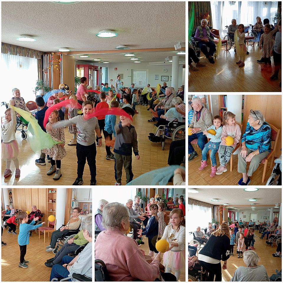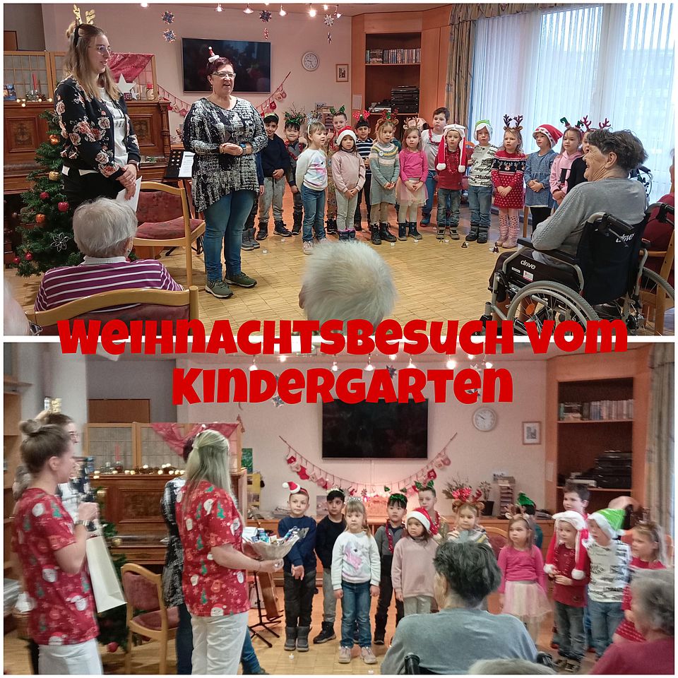 Die regelmäßigen Besuche des Kindergartens „Kinderland“ haben sich als ein wertvolles Erlebnis für beide Generationen erwiesen. Mit abwechslungsreichen Aktivitäten bringen die Kinder Freude und Lebendigkeit in den Alltag unserer Bewohner. Zu den bisherigen Höhepunkten gehörten gesellige Vormittage mit Gesellschaftsspielen, bei denen die Bewohner und Kinder gemeinsam ihre Lieblingsspiele spielten. Gemeinsame Sporteinheiten, angepasst an die Fähigkeiten, boten eine willkommene Abwechslung. Die Bewegung tat nicht nur dem Körper gut, sondern brachte auch viel Freude und Lebenslust mit sich. Ein besonderes Highlight war das kleine Weihnachtsprogramm, bei dem die Kinder gemeinsam mit den Bewohnern Weihnachtslieder sangen und festliche Stimmung verbreiteten. Die funkelnden Augen zeigten deutlich, wie sehr diese Momente allen Beteiligten ans Herz gingen. Hierfür bedanken wir uns recht herzlich.