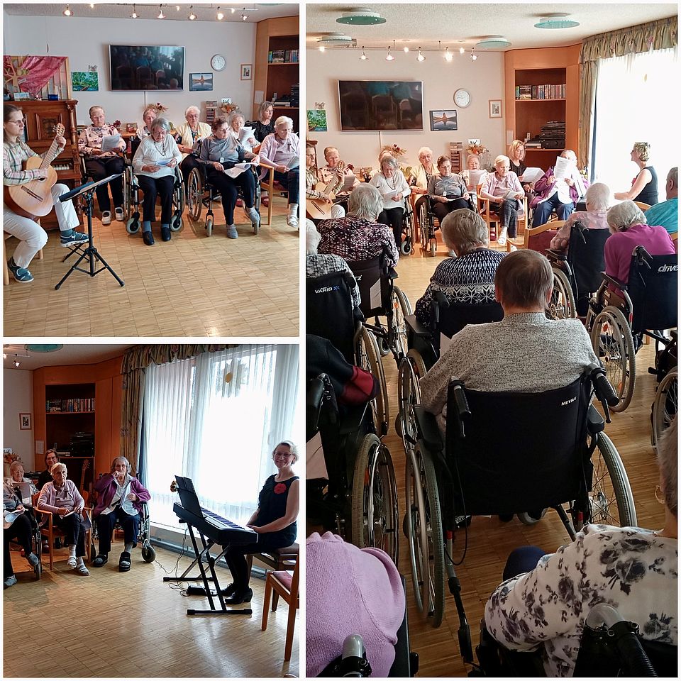 Schlagerstündchen mit Herz: Unsere Bewohnerinnen sangen gemeinsam im Chor des Hauses, begleitet unter der Leitung von Frau Prüger am Klavier und unserer Mitarbeiterin der sozialen Betreuung an der Gitarre. Bekannte Melodien, gute Stimmung und viele fröhliche Gesichter füllten den Raum.